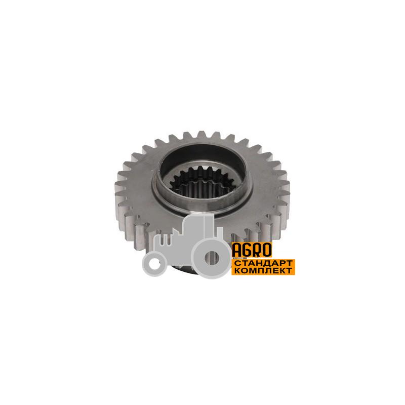 Стальная деталь сложной конструкции. Для соединения с приводной звездочкой в ступице выполнены ответстия и шлицевые пазы для соединения с звездочкой вала. Деталь изготовлена из специальной стали что обеспечивает максимальную прочность и износостойкость.